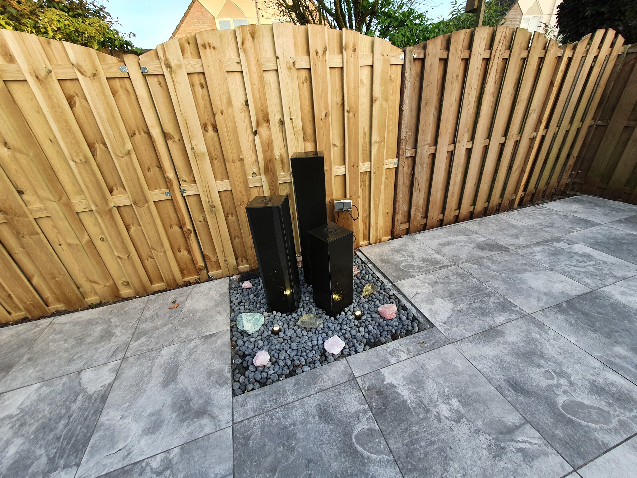 Gemaakt van zwart basaltsteen. Het wordt nog zwarter als er water er overheen loopt, blijft mooi, dit in tegenstelling tot hardsteen wat onderhoud nodig heeft. In de zuilen kan een ledlampje in geplaatst kan worden, maar het is mooier om er in het donker een spot op te richten zodat het geschitter van het water goed te zien is.